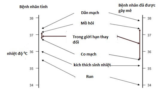 Sau khi gây mê toàn thể, “bộ điều nhiệt” ở vùng dưới đồi được “đặt” ở mức nhiệt độ thấp hơn bình thường. Sự trao đổi nhiệt giữa cơ thể và môi trường xảy ra dưới 4 cơ chế: