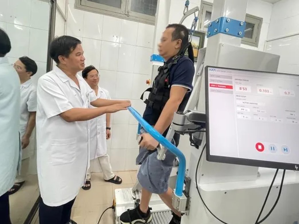 Gần đây, bệnh nhân đã được chỉ định phục hồi chức năng vận động bằng hệ thống robot tập luyện. Sau khi được robot huấn luyện dáng đi, bệnh nhân đã có thể kiểm soát thăng bằng khi đi lại tốt hơn. Bệnh nhân chia sẻ hiện anh đã hồi phục được khoảng 90% sức khỏe sau tai biến.