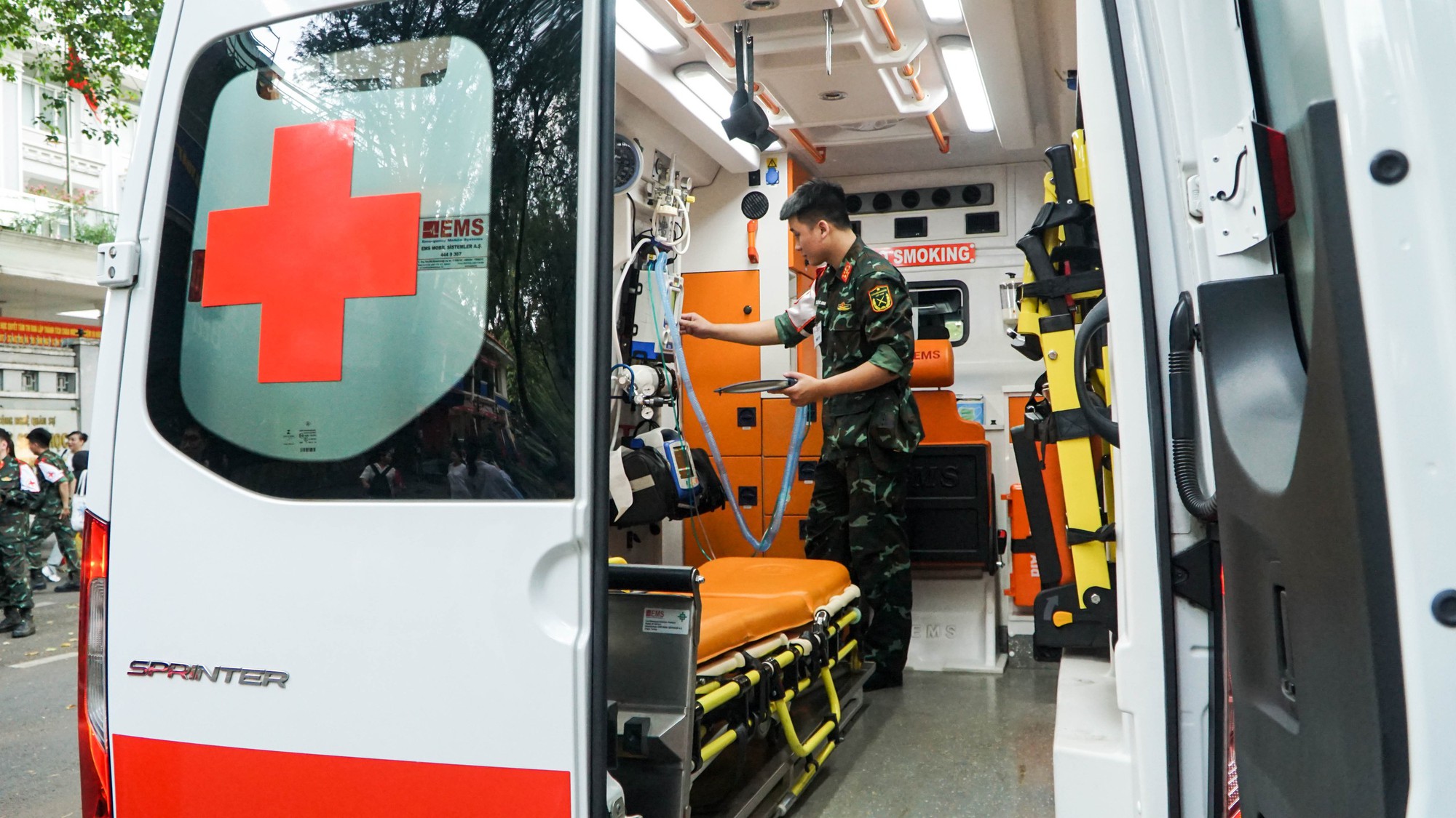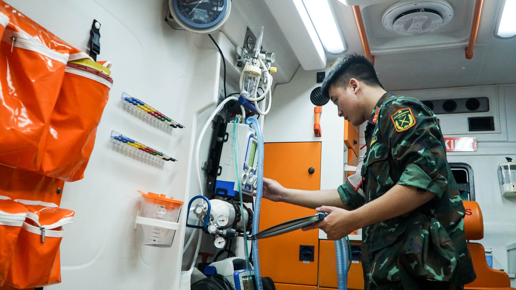 Xe được trang bị đầy đủ máy thở, máy sốc điện, monitor theo dõi, máy hút dịch và cán di động, vận hành như một phòng cấp cứu mini.