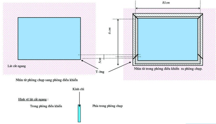 - Đục sẵn khung kính chì có kích thước: Rộng 1210mm x Cao 910 mm, cách sàn 1m(Nếu khách hàng sử dụng kính chì 1,2m x 0,9m).