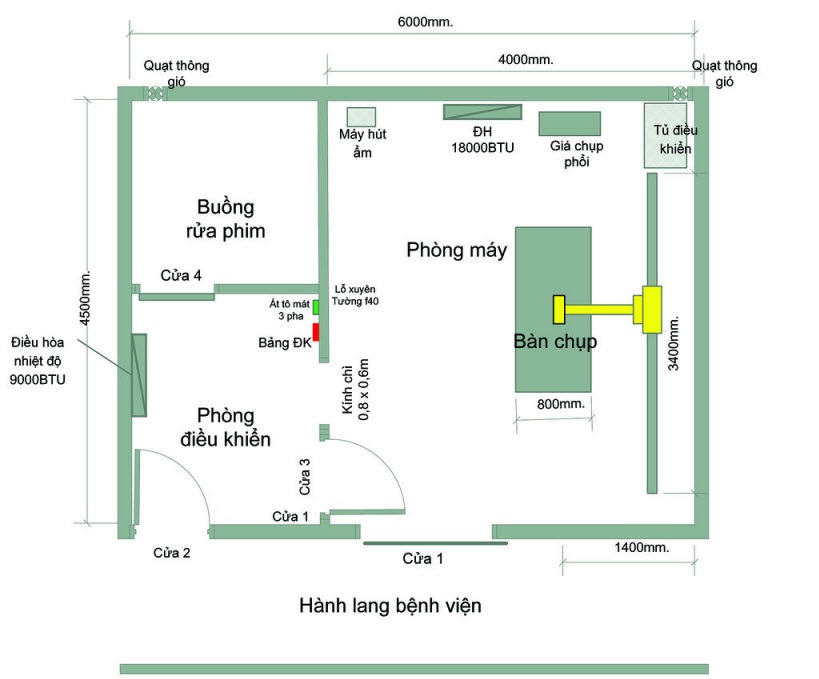 - Phòng điều khiển, Phòng đặt máy và Phòng thăm khám với vị trí được bố trí như hình vẽ trên