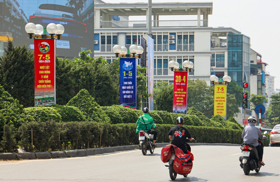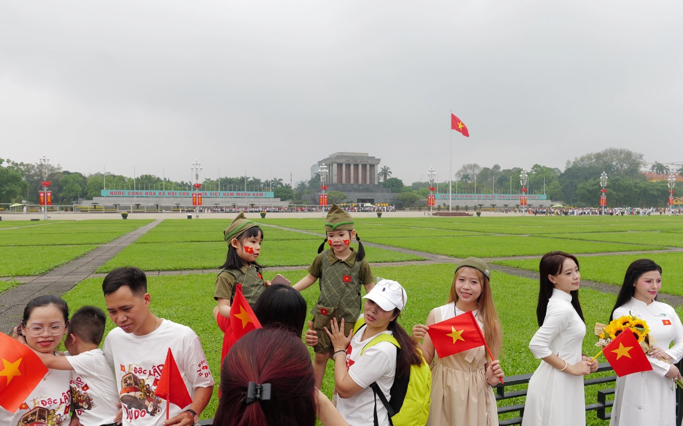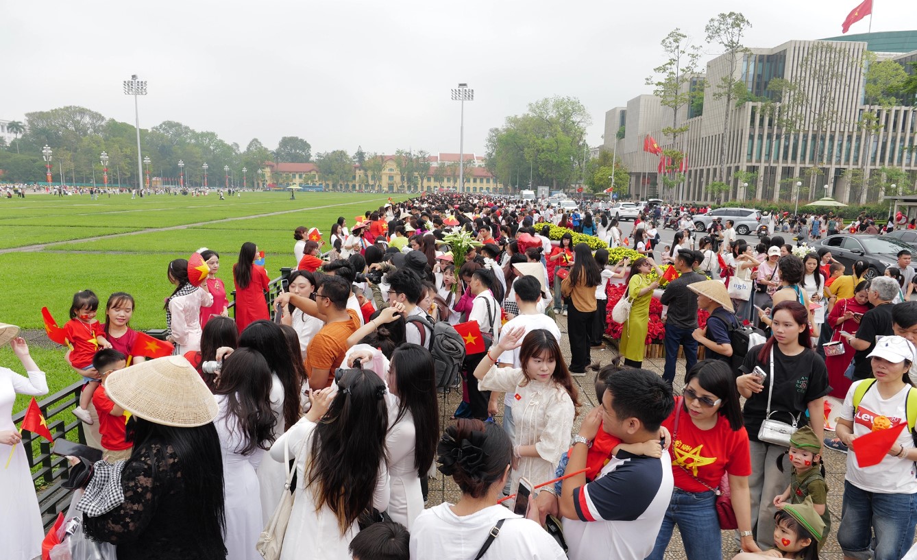 Chiều 27/4, những con đường hướng về quảng trường Ba Đình tấp nập người và phương tiện xếp hàng tham quan, chụp ảnh. Nhiều người chọn trang phục truyền thống, mang theo cờ Tổ quốc chụp ảnh kỷ niệm nhân dịp 50 năm giải phóng miền Nam, thống nhất đất nước (30/4/1975-30/4/2025).