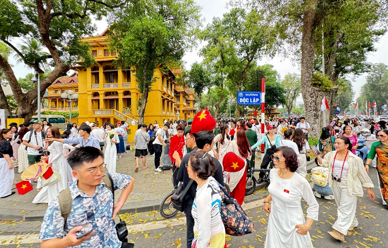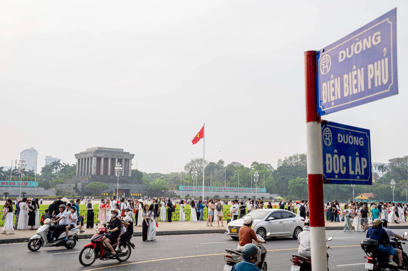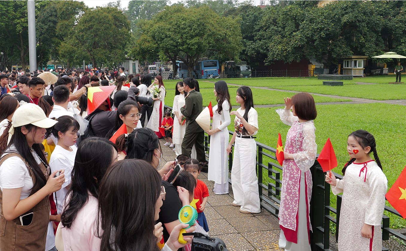 Tại đường Độc Lập và trước Lăng Bác, rất đông người dân trong trang phục áo dài cầm cờ Tổ quốc đứng chụp ảnh kỷ niệm bên ngoài hàng rào. Địa điểm đặc biệt đông vào những hôm thời tiết có nắng đẹp.