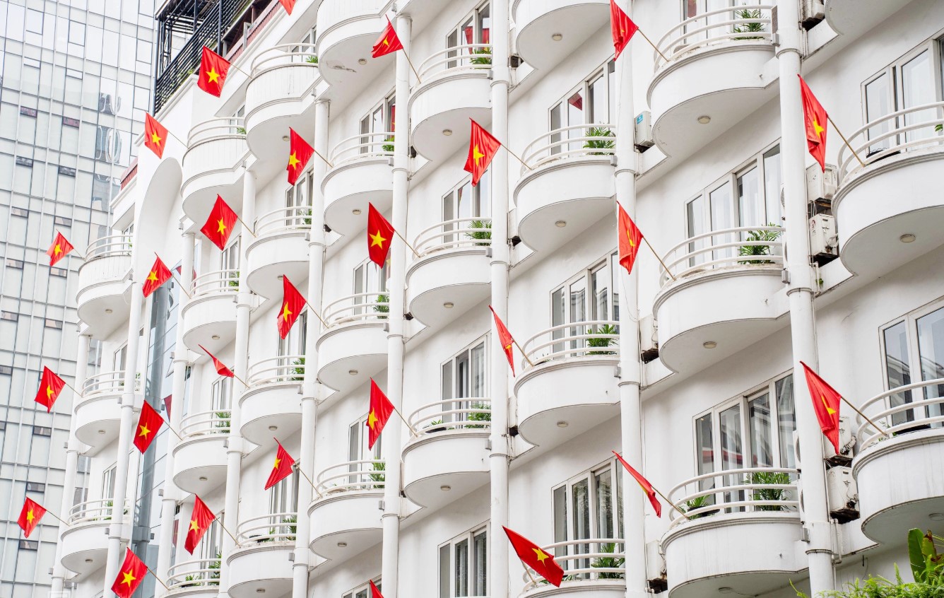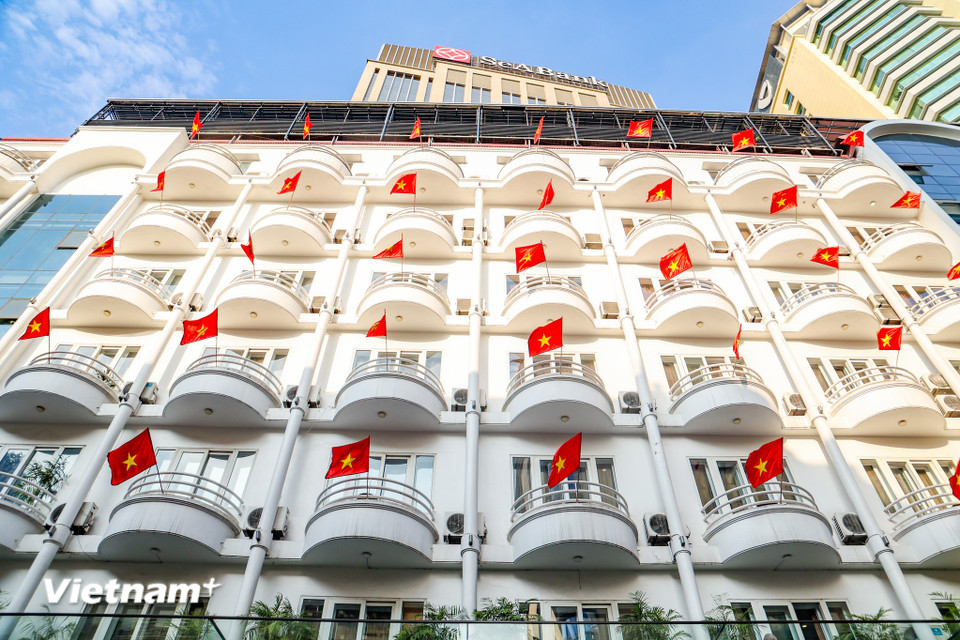 Một khách sạn trên đường Tông Đản treo nhiều cờ ở ban công các phòng. Địa điểm này hàng năm đều treo cờ vào dịp lễ 30/4 thu hút nhiều bạn trẻ tới chụp hình.