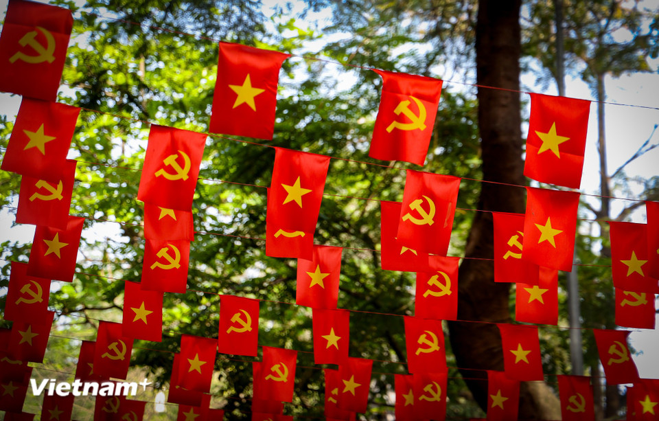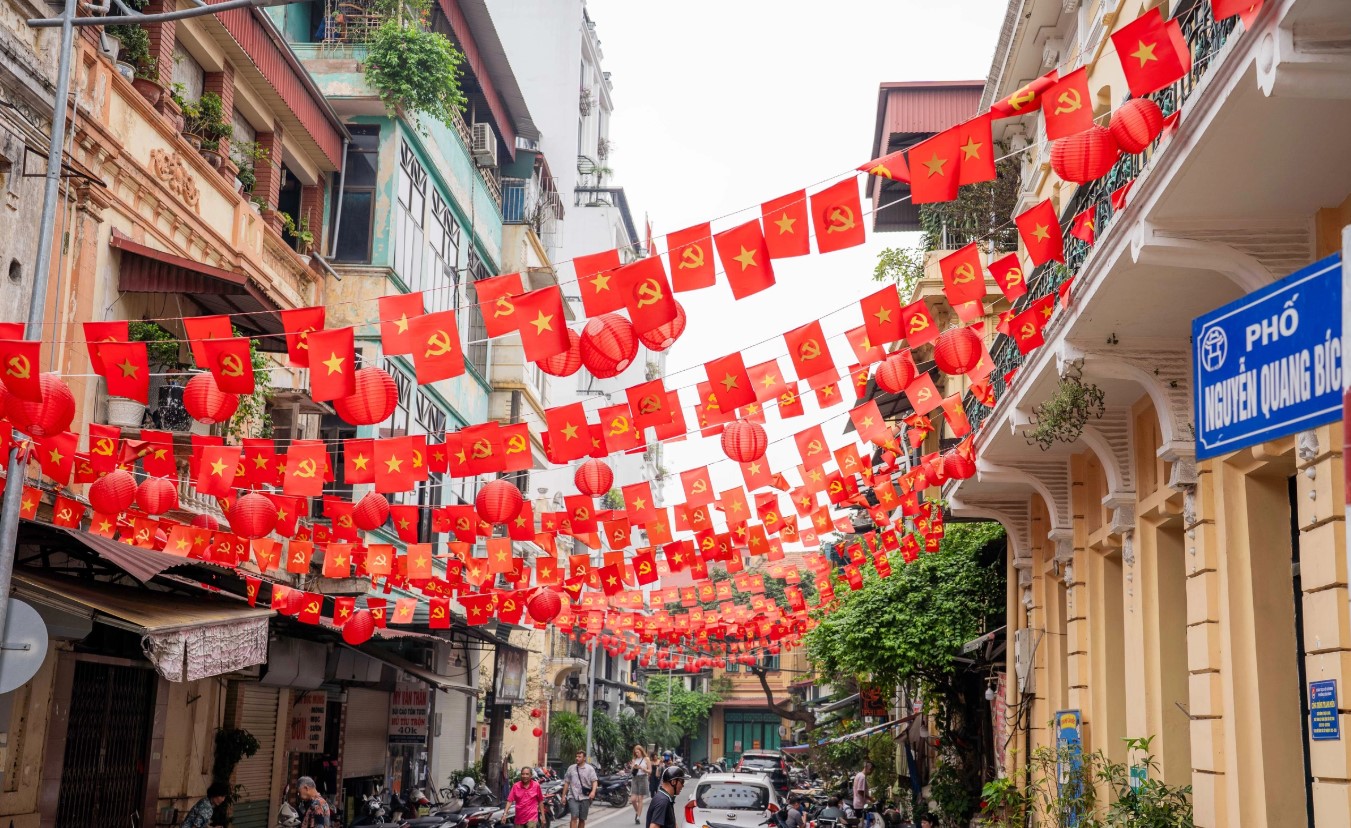 Phố Nguyễn Quang Bích có nhiều ngôi biệt thự Pháp cổ cũng được trang trí nhiều cờ đỏ, là điểm đến nổi bật từ giữa những ngày tháng 4/2025
