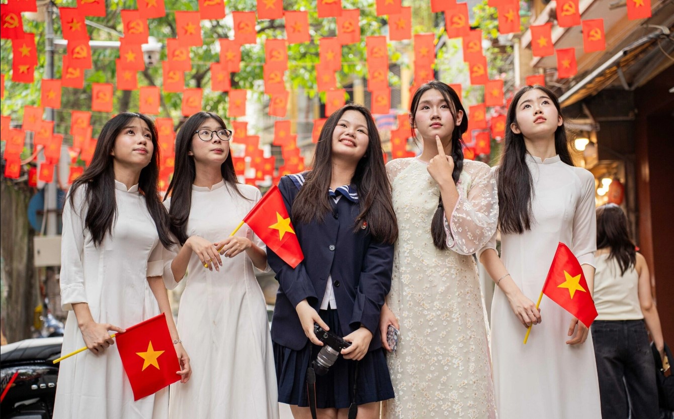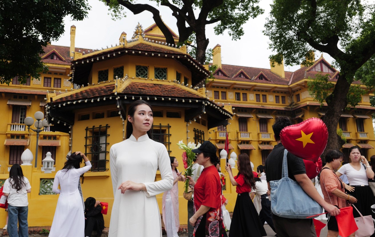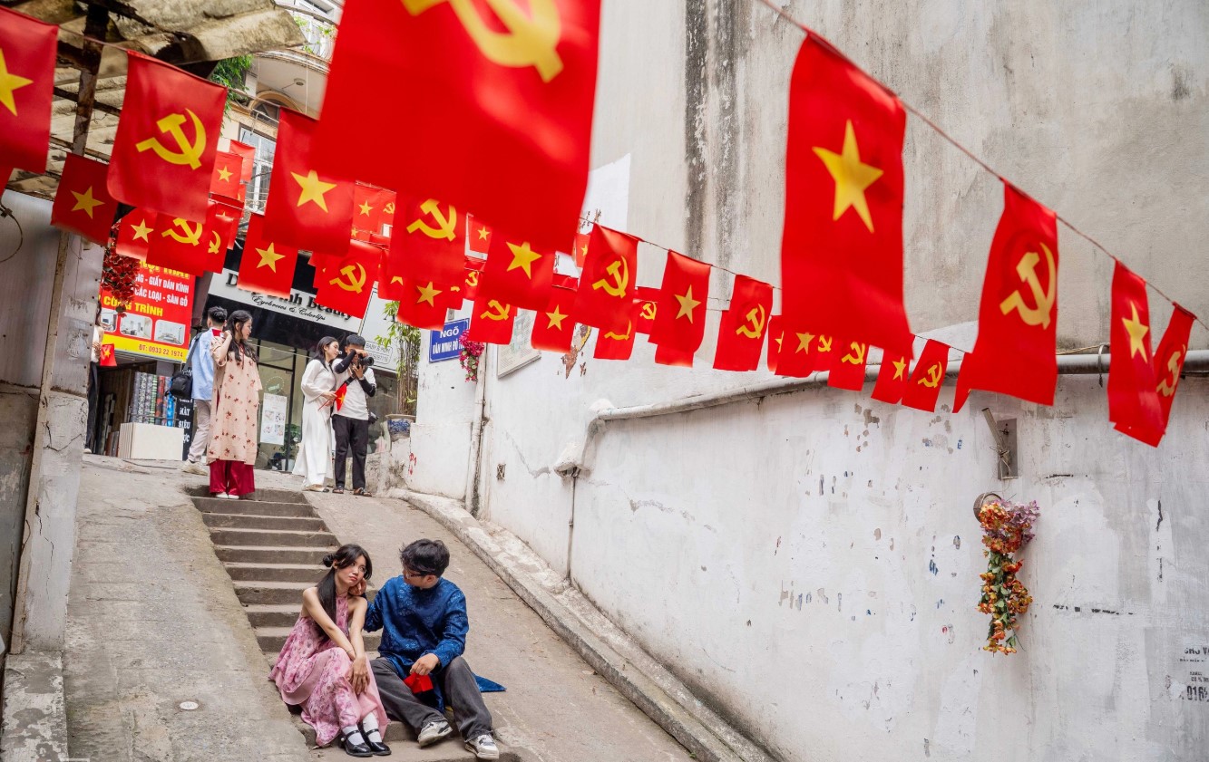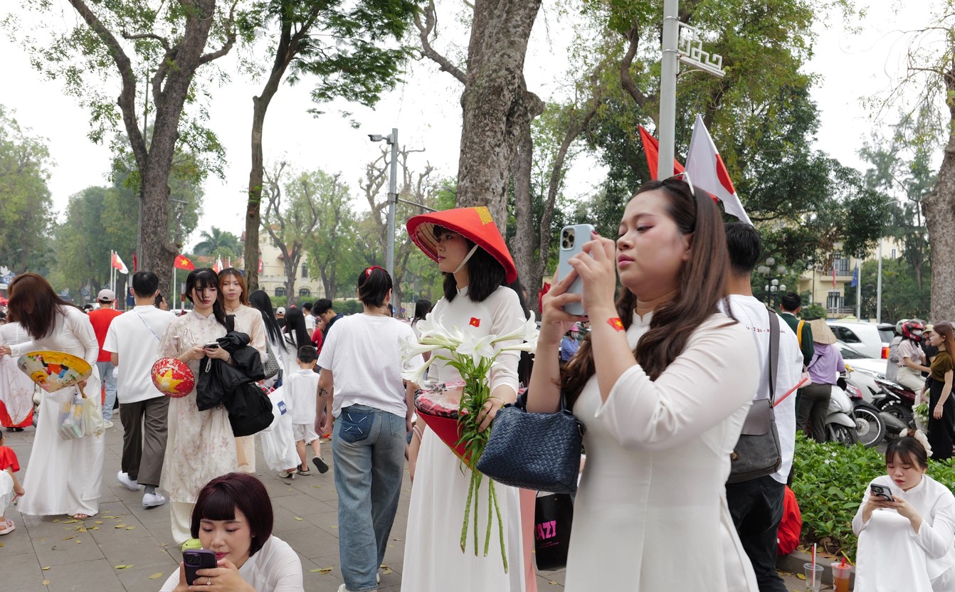 Thủ đô Hà Nội - Hàng nghìn người dân trong trang phục áo dài, mang theo cờ, hoa đổ về quảng trường Ba Đình, bên Lăng Chủ tịch Hồ Chí Minh chụp ảnh kỷ niệm 50 năm giải phóng miền Nam, thống nhất đất nước, cận lễ 30/4/2025. Nhiều tuyến đường, con ngõ tại Hà Nội trang trí cờ đỏ sao vàng cùng biểu ngữ chào mừng 50 năm thống nhất đất nước, thu hút du khách đến vui chơi, check in.