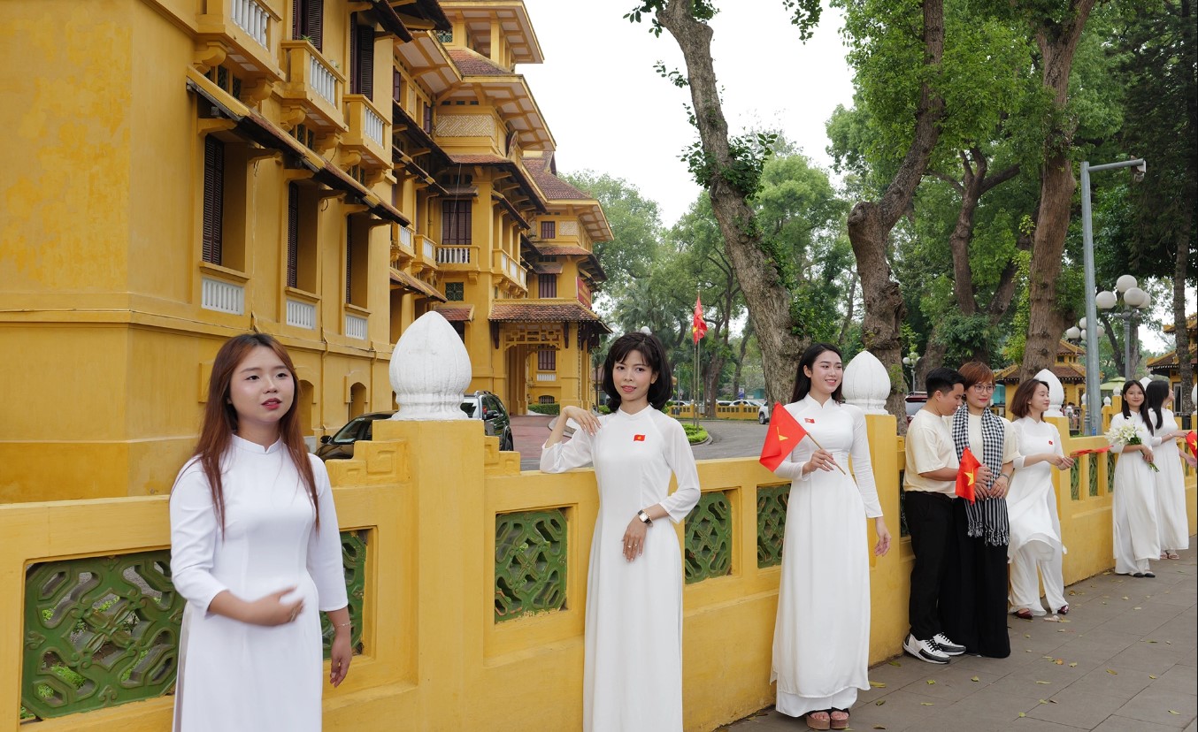 Phía đối diện Lăng Bác là tòa nhà Bộ Ngoại Giao, nơi có bức tường rào sơn vàng cùng biệt thự cổ kính được đông đảo bạn trẻ chọn ghé chụp ảnh. Trang phục áo dài trắng truyền thống được giới trẻ ưa chuộng bởi có thể chụp được ở nhiều bối cảnh và ''toát lên tinh thần dân tộc''.