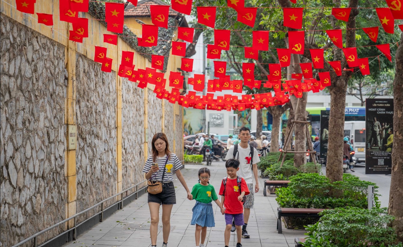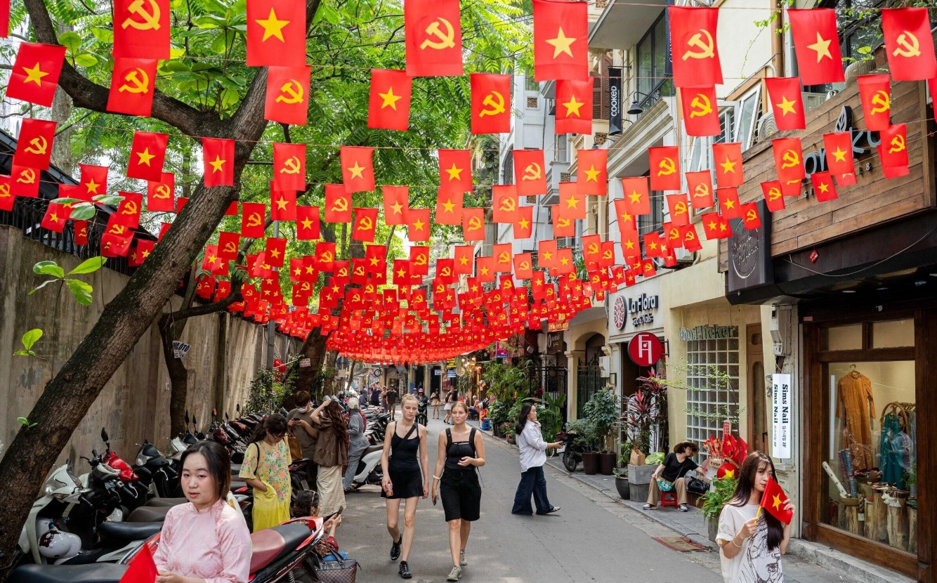 Phố Ấu Triệu, quận Hoàn Kiếm, dài khoảng 200 m treo nhiều cờ đỏ sao vàng trên cao. Con phố nằm cạnh nhà thờ Lớn nên thu hút đông du khách trong và ngoài nước đến vui chơi, chụp ảnh tại Hà Nội những ngày gần đây.