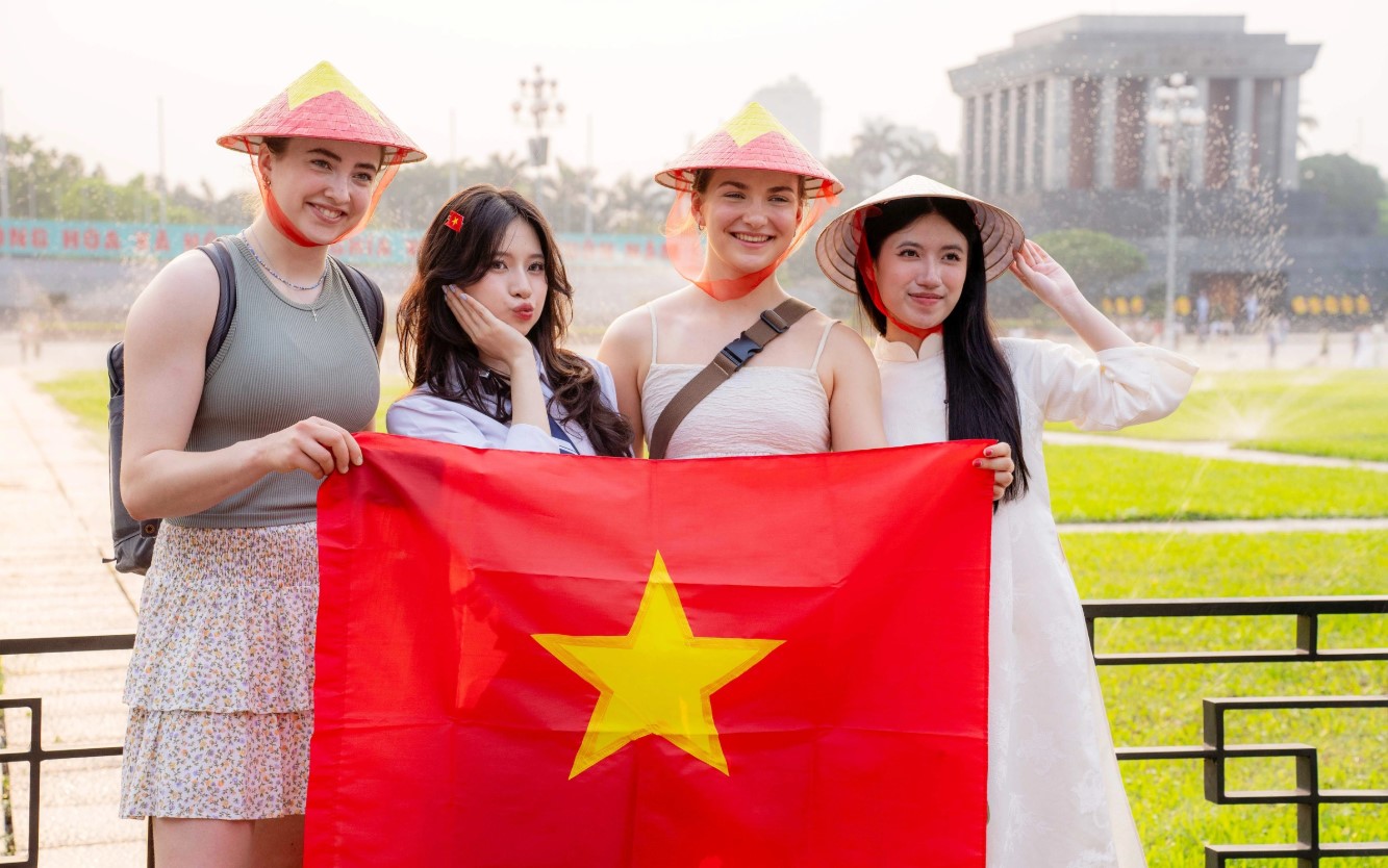 Du khách nước ngoài thích thú đội nón lá cầm Quốc kỳ chụp ảnh chung với người địa phương ở quảng trường Ba Đình.