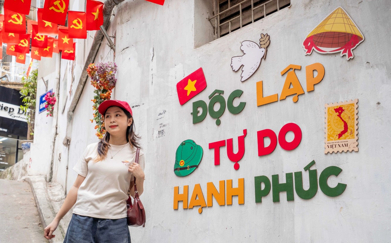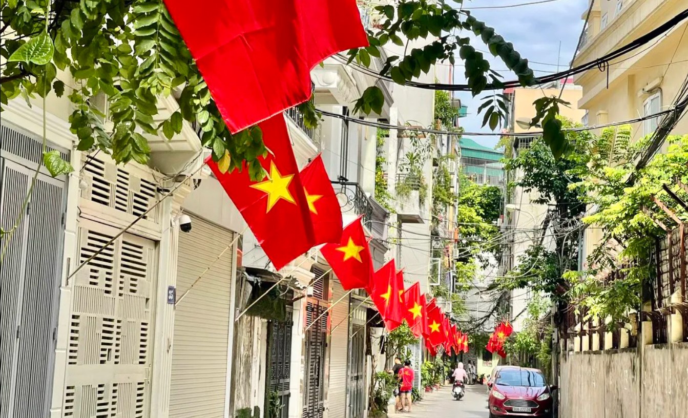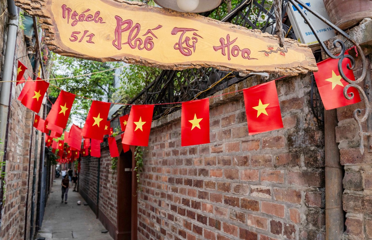 Ngách 5/1 phố Từ Hoa, quận Tây Hồ chỉ rộng khoảng 1,5 m cũng treo cờ trong dịp này. Ngách nhỏ với những bức tường ốp gạch tạo cảm giác cổ kính phù hợp check in với áo dài, được nhiều bạn trẻ tìm đến.